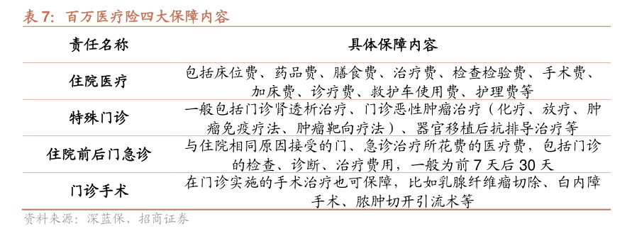 从百万医疗险的产品形态来看,基础保障部分通常包含门急诊和住院报销,如某网销百万医疗险产品责任显示,一般医疗保险金涵盖的报销责任包括:住院医疗费用、特殊门诊医疗费用、门诊手术医疗费用、住院前后30天门急诊医疗费用。