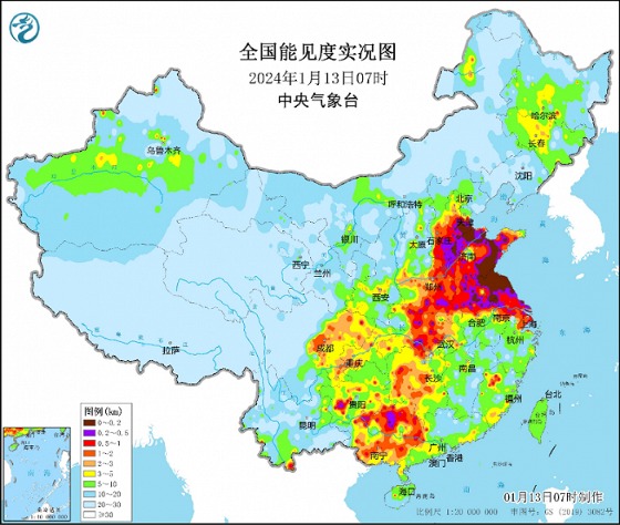 据中央气象台1月13日消息,今晨,北京南部、天津南部、河北中南部、山东、河南大部、安徽中北部、江苏、上海、湖北中部、湖南西部、贵州南部、广西北部等地部分地区出现能见度不足1公里的大雾,局地能见度不足200米。